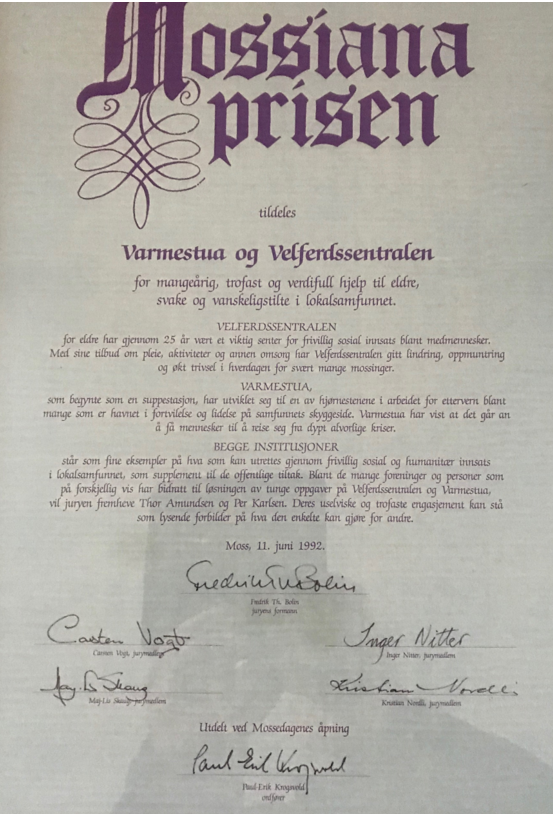 Varmestua fikk allerede i 1992 Mossiana-prisen sammen med Frivillighetssentralen. I 2011 fikk Liv Hansen Mossiana-prisen for sitt store arbeid for Varmestua gjennom nesten 25 år og Varmestua fikk et bidrag på 100 000 kroner fra Rygge Vaaler Sparebanks fond.